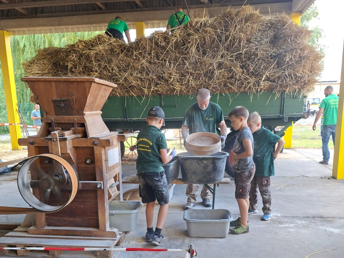 Auch 2025 war der Heimatverein Friedrichsaue wieder mit Dreschmaschine und Mühle beim „Historischen Erntefest“ in Bernburg-Strenzfeld. Das frisch gemahlene Mehl war wie immer der Renner –